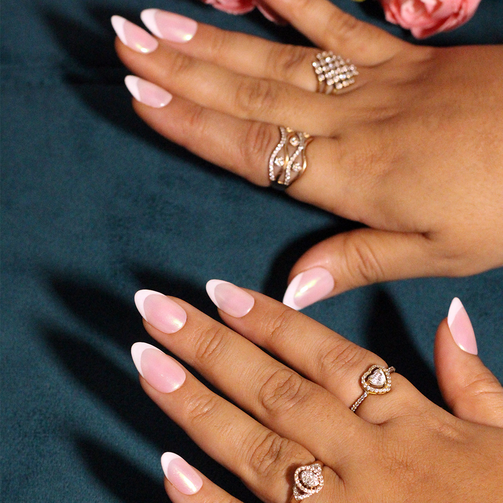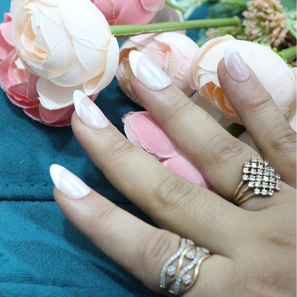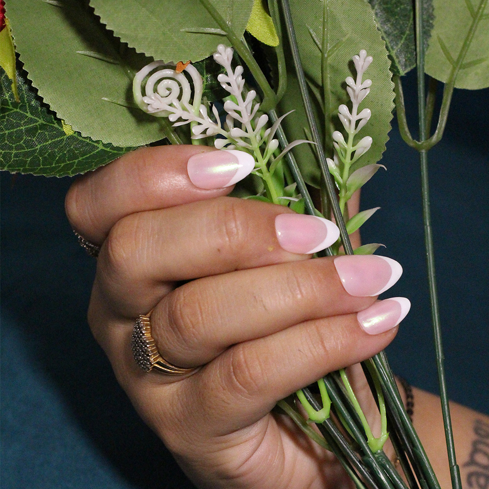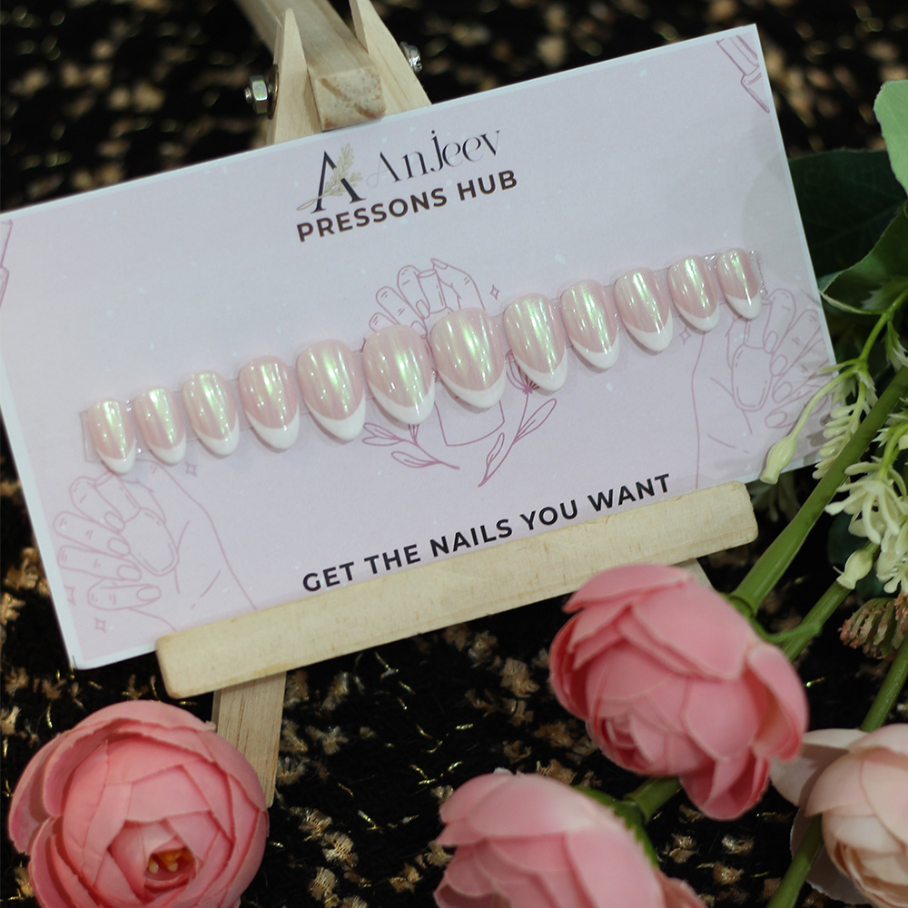 Enhance your style with these luxurious press-on nails, featuring a pearlescent blush pink base paired with classic white French tips. The luminous finish adds a subtle glow, making them perfect for weddings, parties, or everyday sophistication.