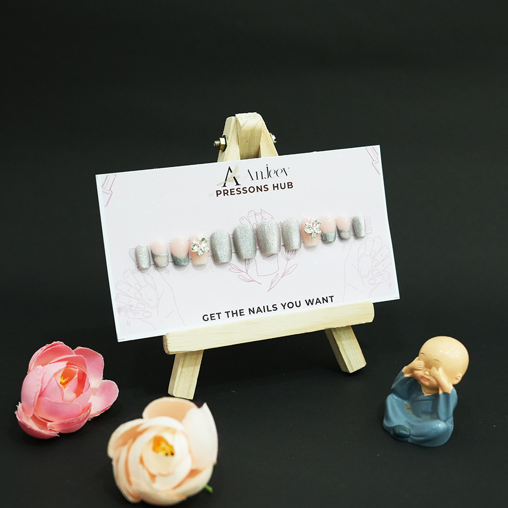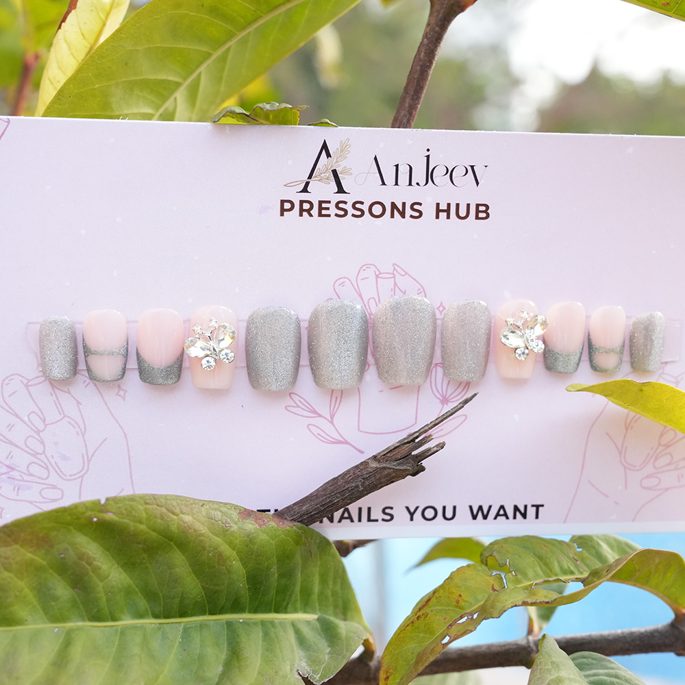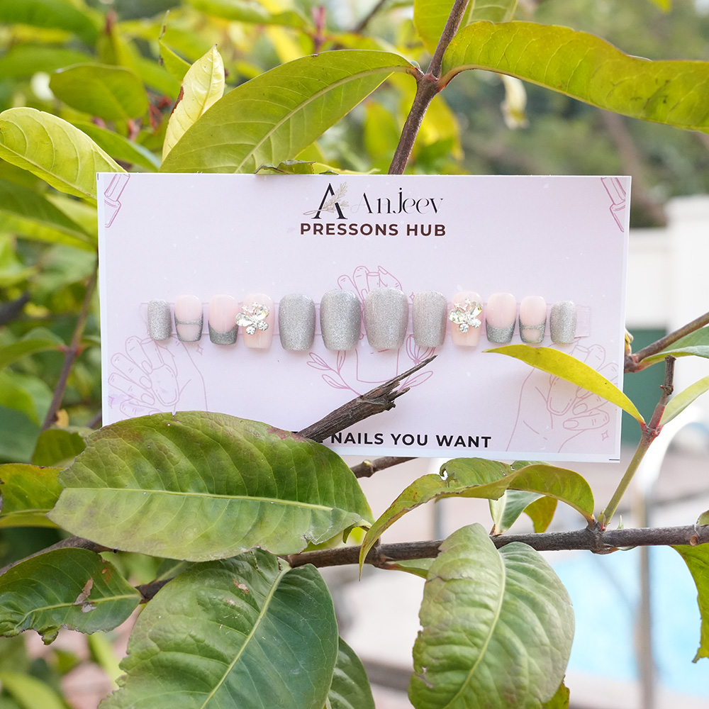 Give your nails a stunning makeover with this luxurious set of Anjeev Press-On Nails! Designed to bring elegance and sophistication to your fingertips, this set blends soft nude tones with shimmering silver accents and dazzling rhinestone embellishments.