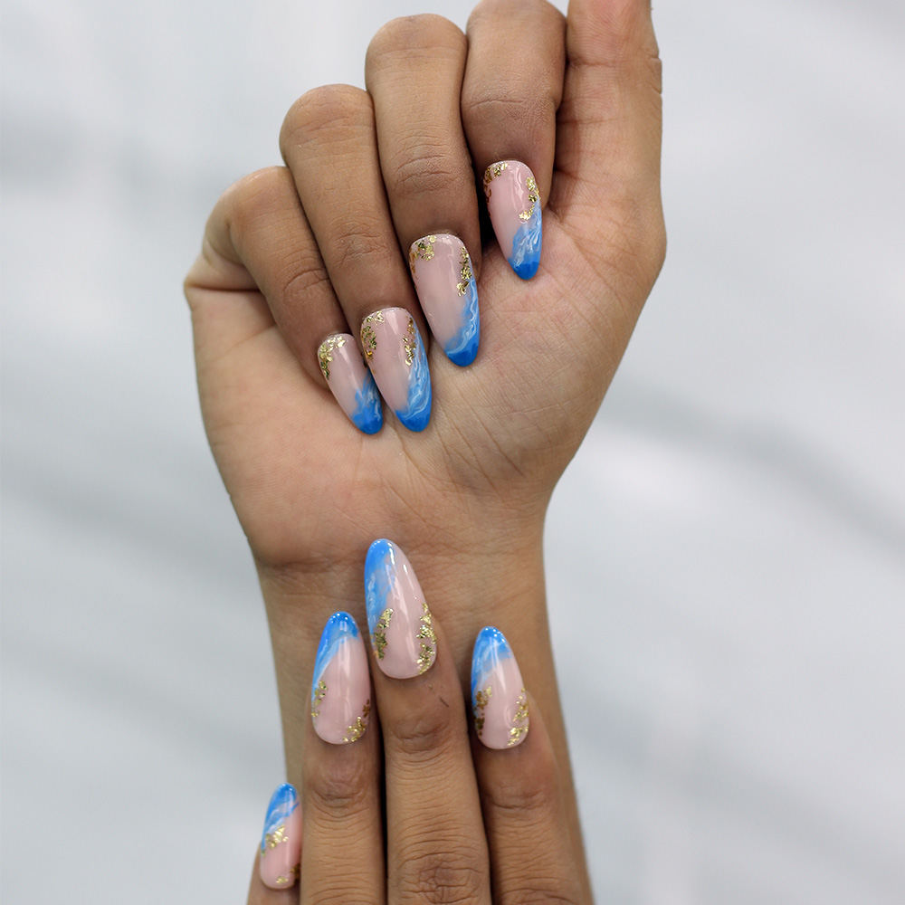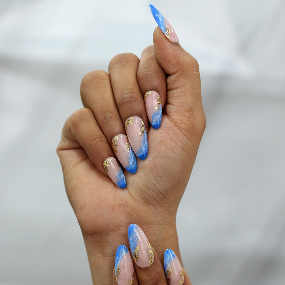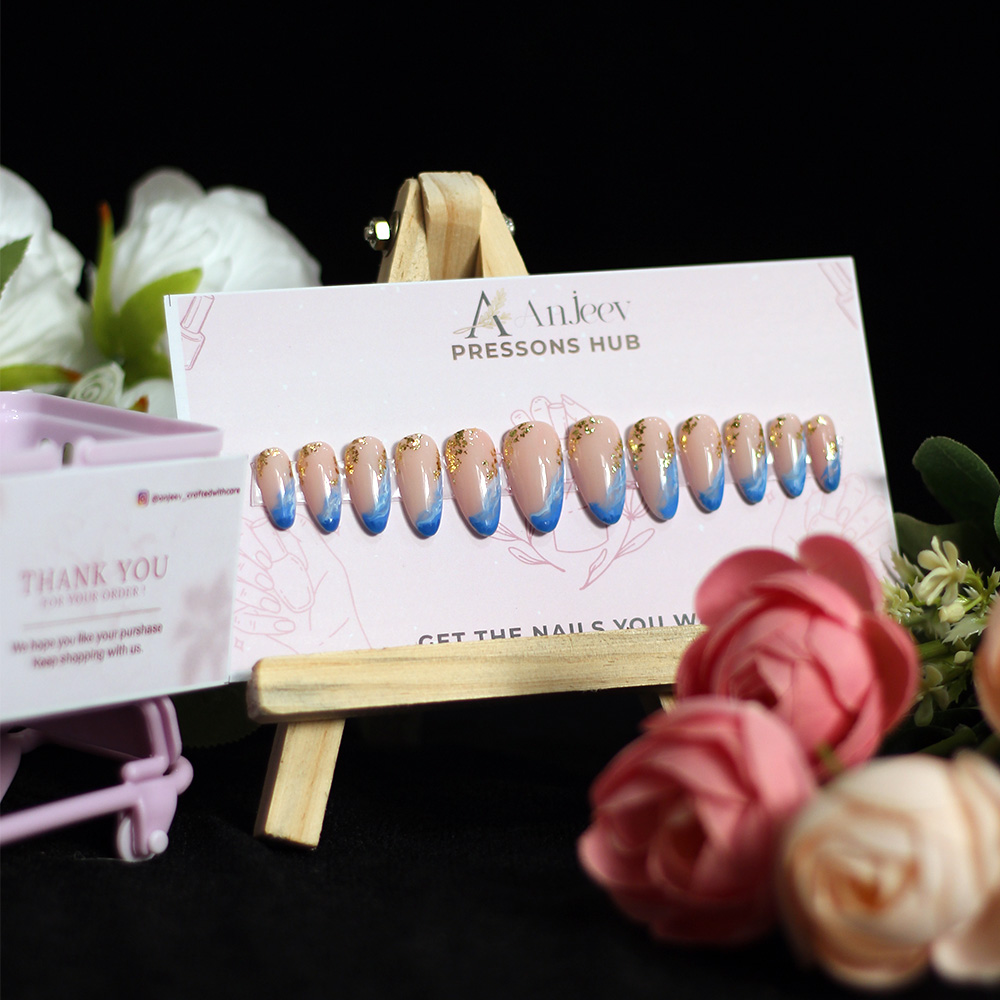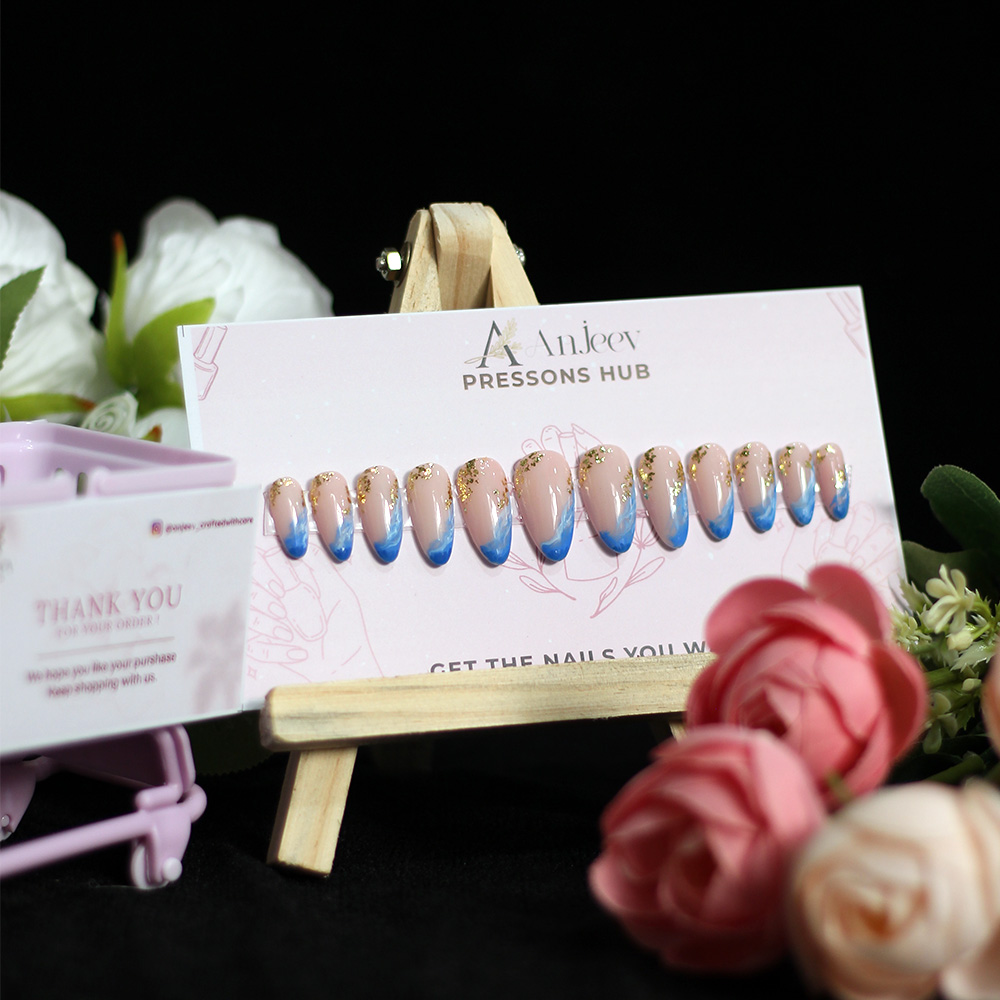 Design: Nude base with bold blue French tips and glittery gold details